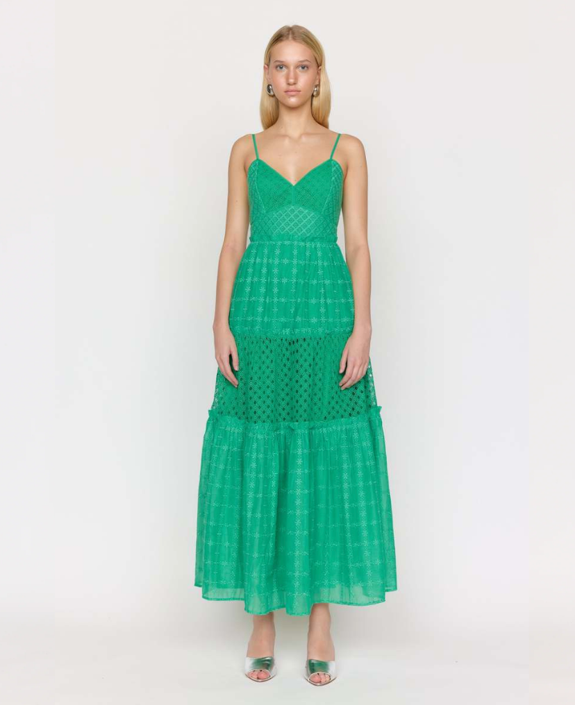 This dress features a soft v-neckline, adjustable straps, zipper back, and a mini ruffle at each skirt tier. The fitted bodice highlights the waist, while the flowing skirt adds graceful movement, creating a flattering and feminine silhouette.