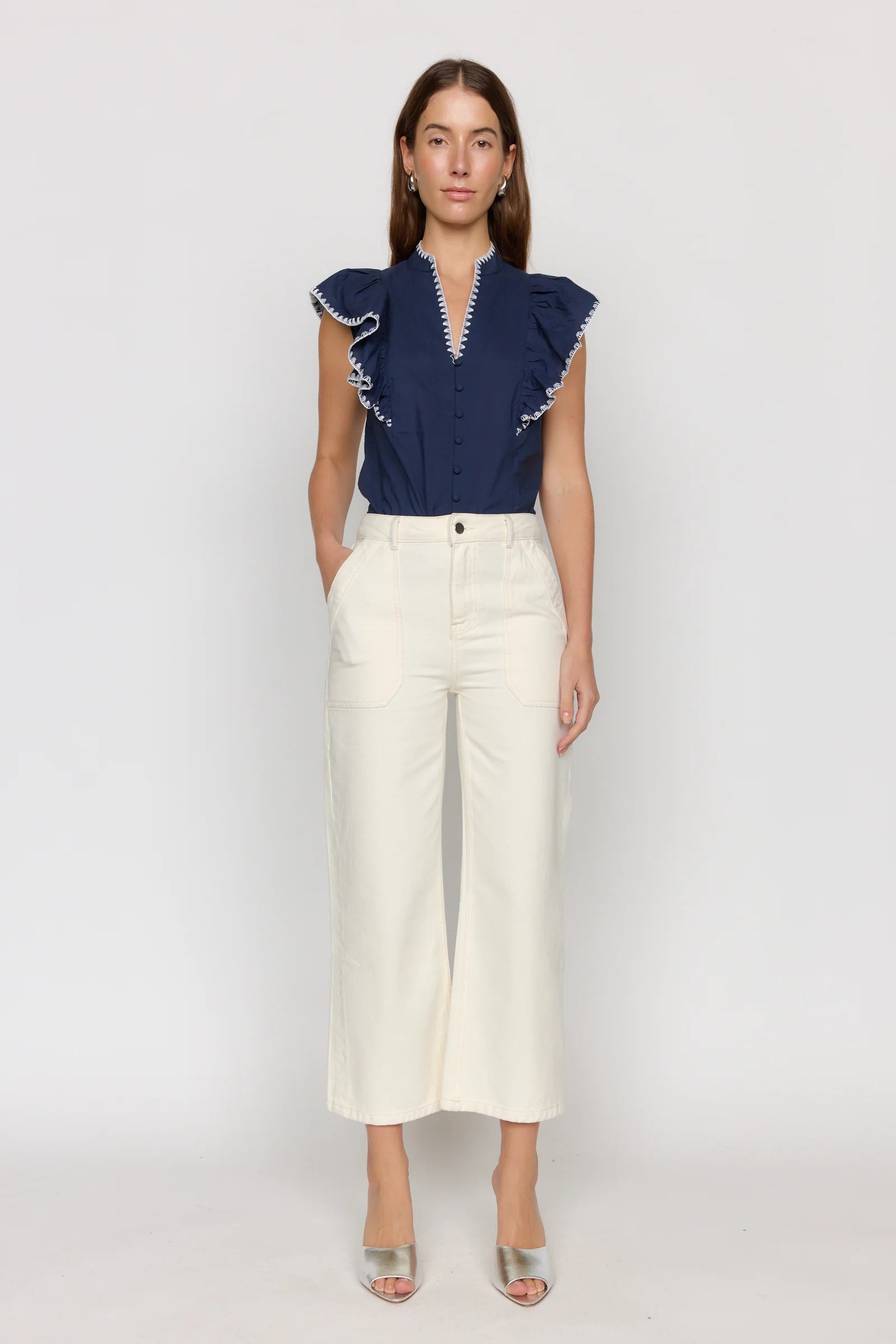 Effortlessly styles, this sleeveless top is highlighted with embroidery piping along the neckline and shoulder ruffles. Crafted from a breathable cotton, it combines comfort with a refined, feminine touch. The embroidered piping adds contrast and elegance, accentuating the playful ruffle details.
