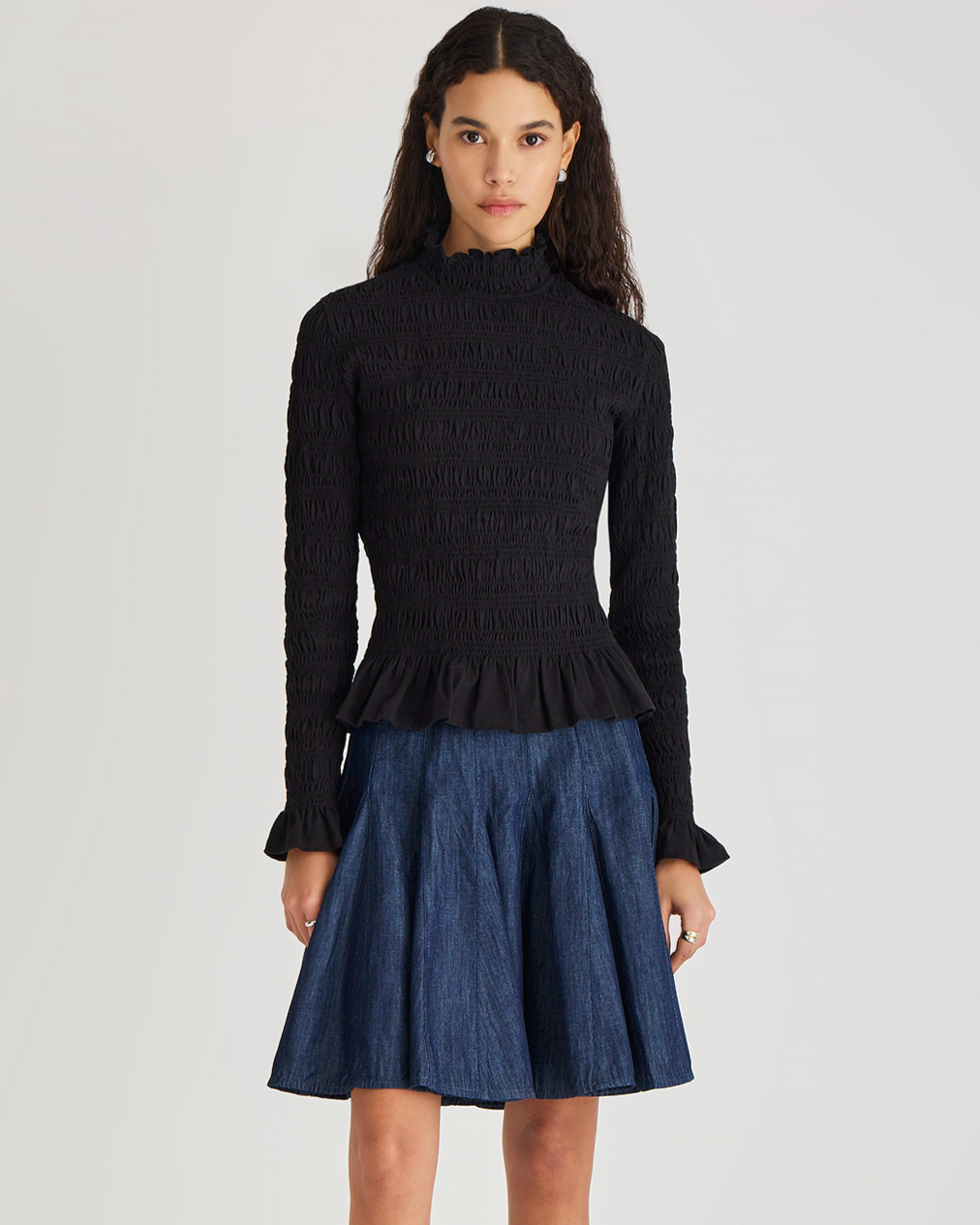 Crafted from mid-weight 100% cotton jersey, its intricate all-over smocking creates a flattering, close-to-the-body silhouette with natural stretch for everyday ease. Full-length sleeves and a gently ruffled hem bring a romantic contrast to its architectural lines.