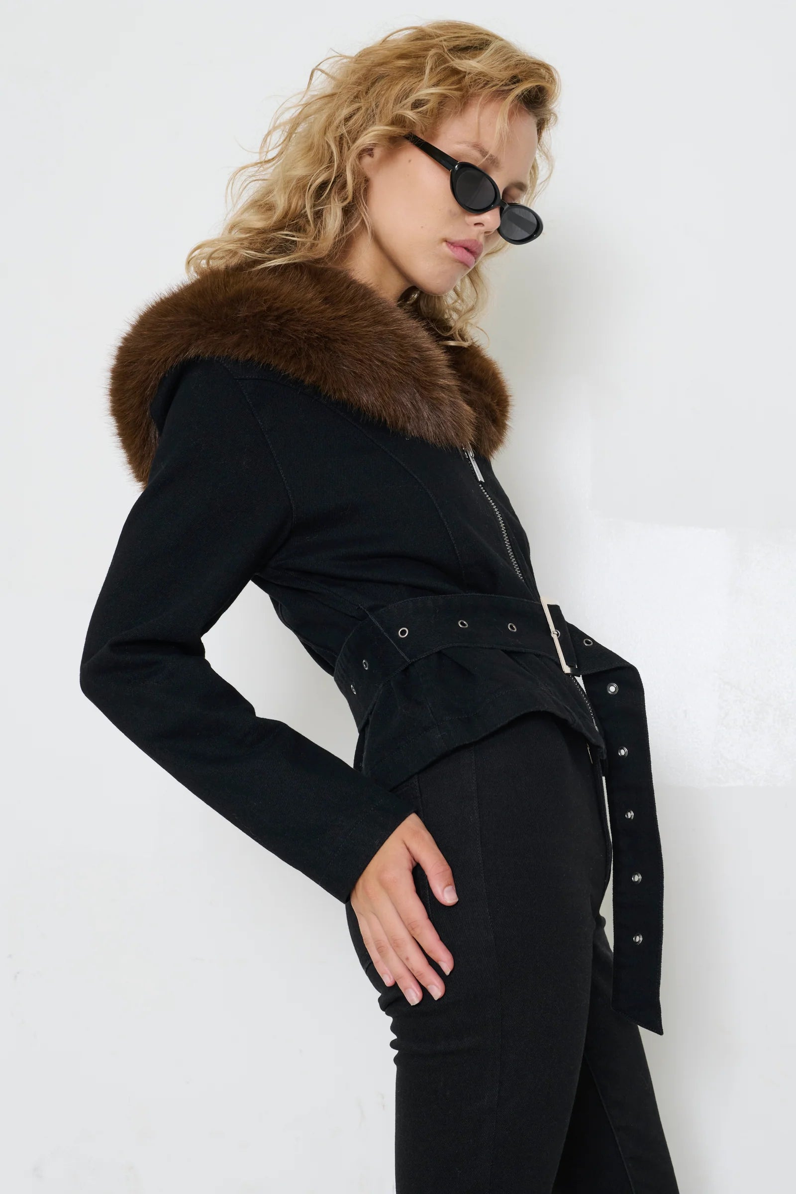 The Carm Jacket is all presence. Cut with a sculpted waist and finished with an oversized, removable faux-fur collar, it plays with contrast. Soft against sharp, classic against bold. Anchored by a statement buckle and subtle edge, it’s the kind of piece that does the talking for you.