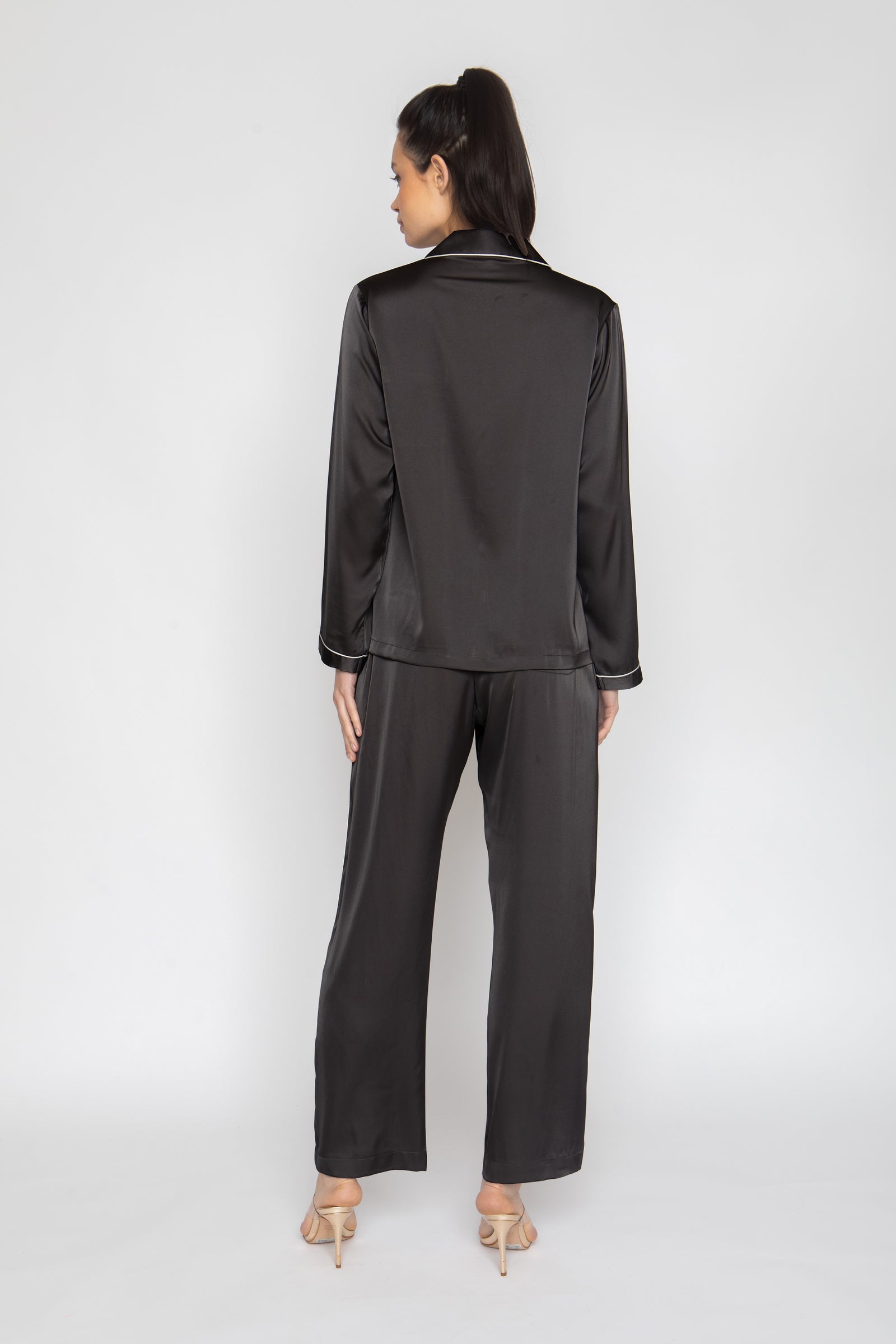 Long-sleeve button-up top with matching full-length pants