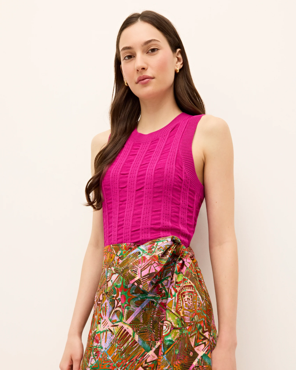 This straightforward crew-neck silhouette, made from a soft ribbed knit fabric, is emboldened by a daring dose of color—a deep all-over pink reminiscent of the Mediterranean’s bright bougainvillea blooms.