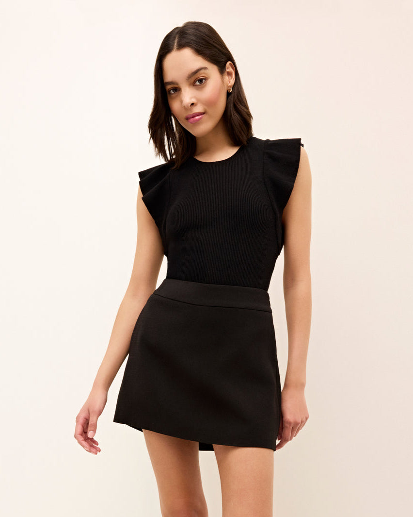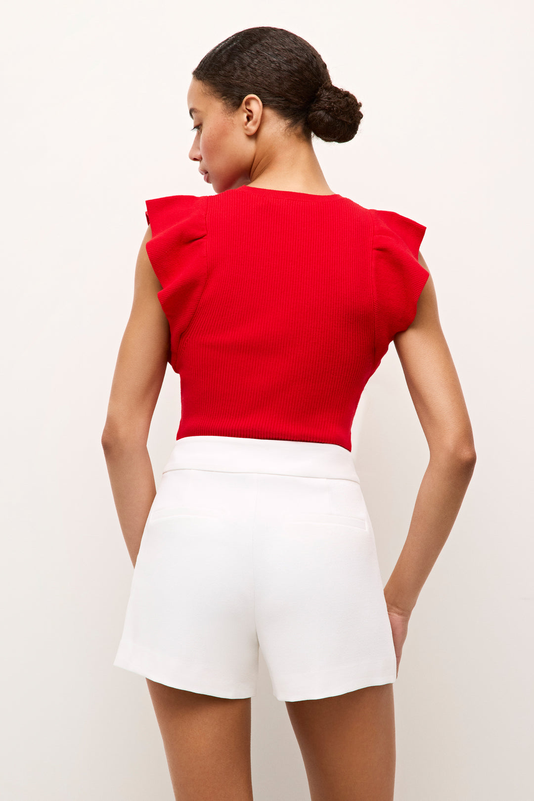 With a ribbed bodice and feminine ruffle sleeves, our figure-flattering Rory top in Cool White is a must-own wardrobe basic that never disappoints. The fitted top was designed to be tucked in.