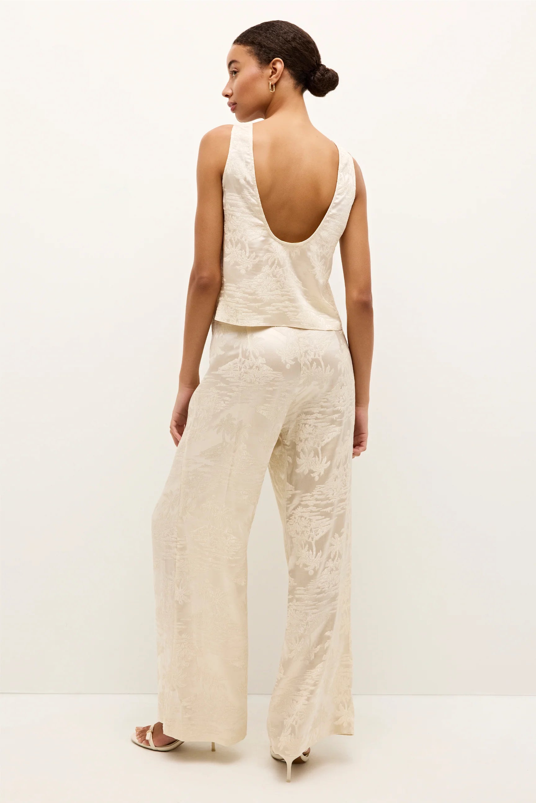 Crafted from palm-printed jacquard silk in a warm summer white, this wide-leg pant evokes timeless seasonal glamour. This pant includes a zipper fly with hook and bar closure, pleated front with adjustable tab at center back waistband, fitted at waist and hips, wide leg opening, 31" inseam, and is unlined.