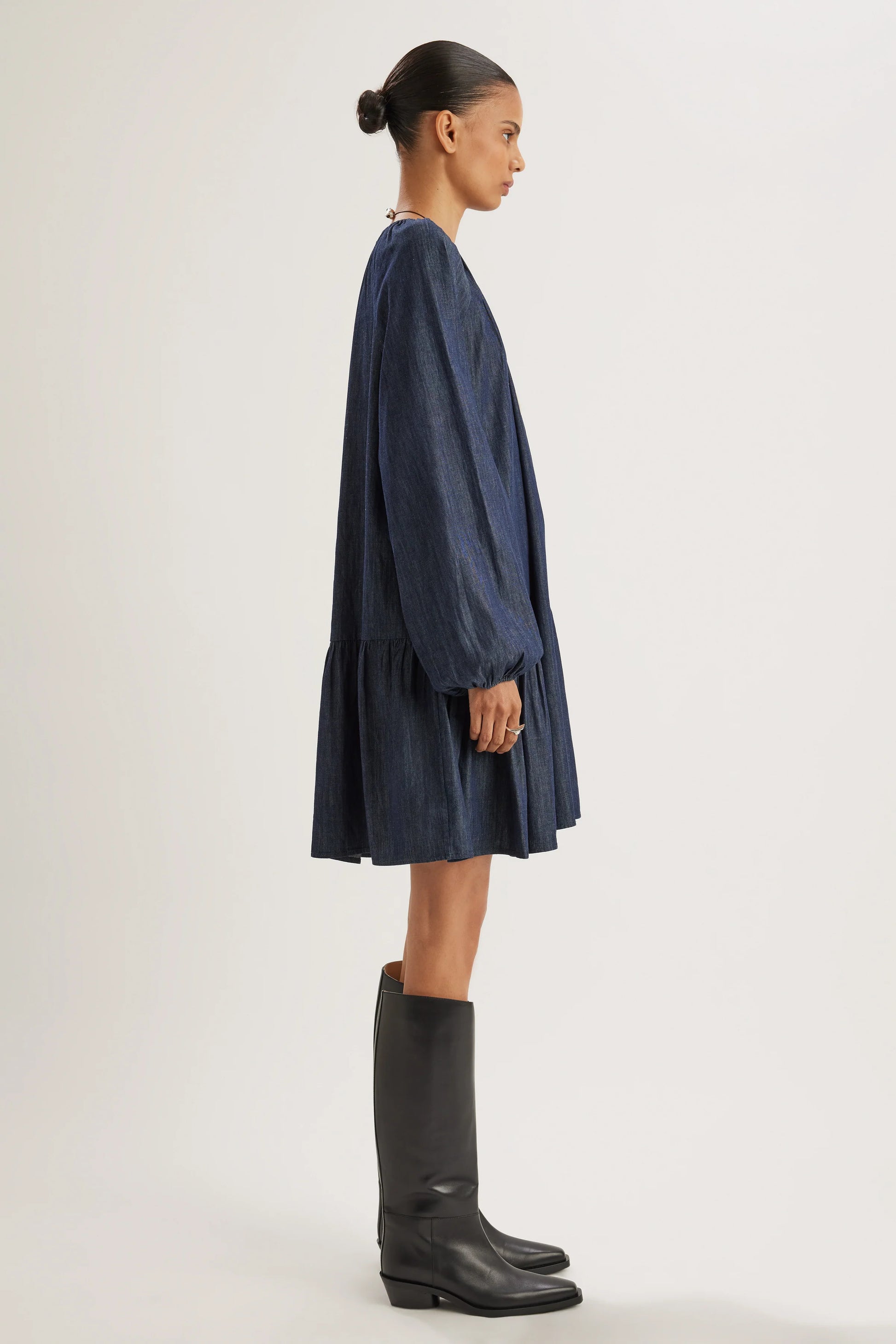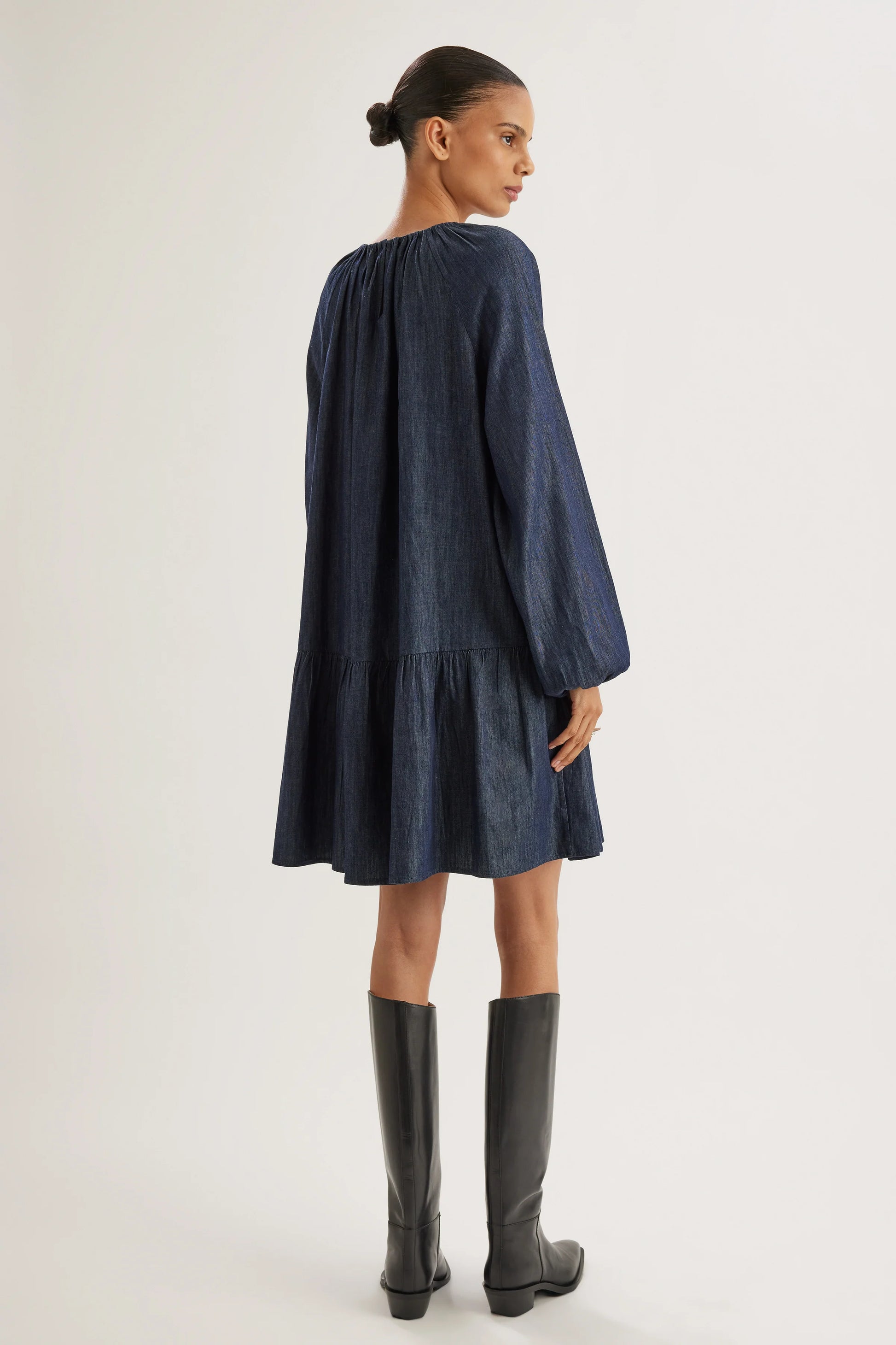 Incorporating 100% cotton denim, the SEYMOUR Dress undergoes a refined transformation in dark denim. This versatile piece crafted from breathable cotton-blend jacquard showcases a gathered neckline, side tiers, and pockets for a chic yet relaxed aesthetic.