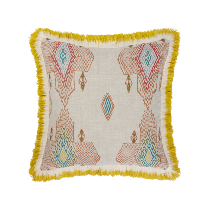 Fabric designed by Kit Kemp, this striking cushion blends vibrant colors with intricate patterns, inspired by nomadic life and traditional textile motifs.